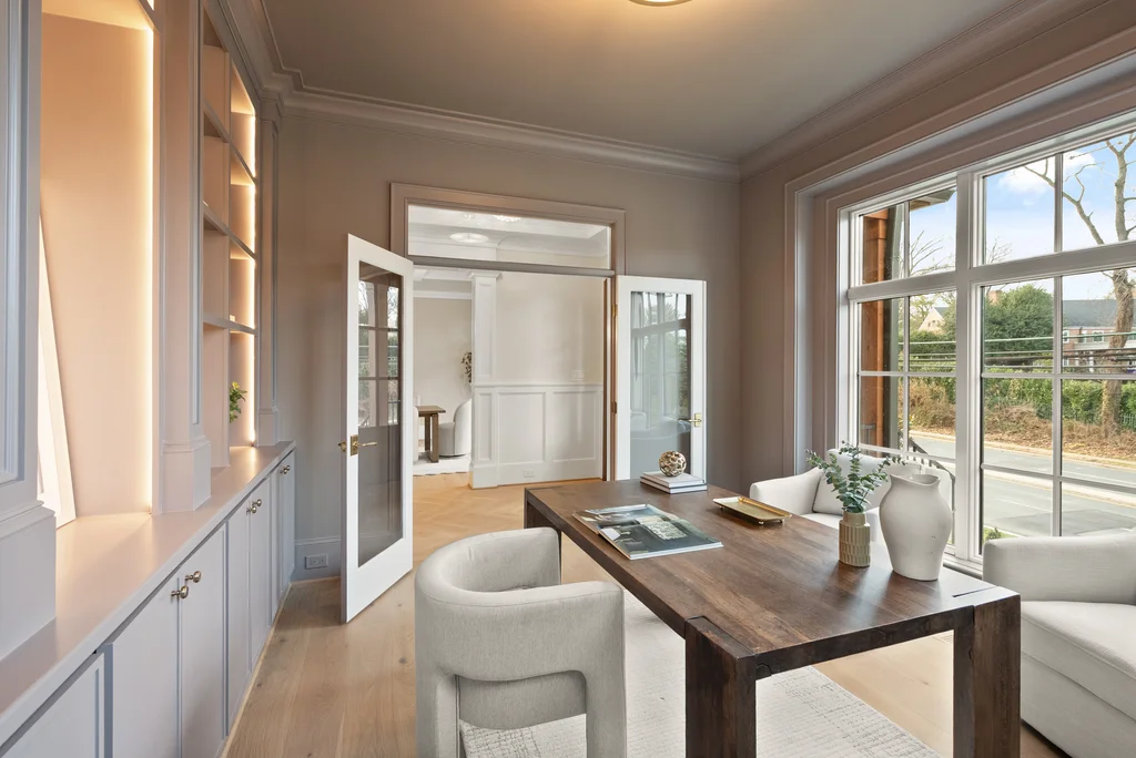 Featuring 6 bedrooms, 6 full baths, and 2 half baths across three expansive levels, the home is designed to accommodate both gracious entertaining and comfortable daily living. A main-level bedroom suite with a full bath and walk-in closet provides ideal flexibility for guests or multigenerational living.